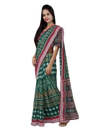 Women’s Sambalpuri cotton saree, Deer and tree design in green color base with red color boarder